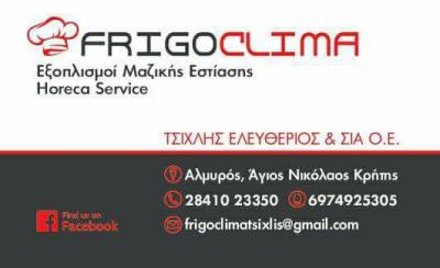 Η εταιρεία Frigoclima εδρεύει στον Άγιο Νικόλαο Λασιθίου και δραστηριοποιείται δυναμικά στον τομέα της μαζικής εστίασης, της επαγγελματικής ψύξης, καθώς και της εγκατάστασης, συντήρησης και επισκευής επαγγελματικού εξοπλισμού για ξενοδοχεία και επιχειρήσεις εστίασης.