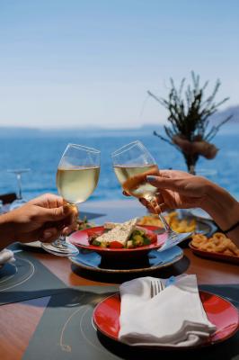 As for sides, refreshing Mediterranean salads elevate the experience, featuring combinations of local Santorini products and extra virgin Greek olive oil.