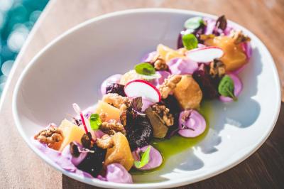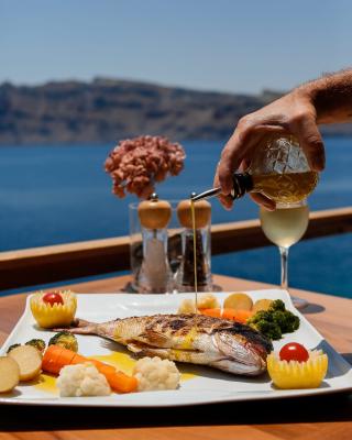 Συνοδευτικά, οι δροσερές μεσογειακές σαλάτες απογειώνουν την εμπειρία, με συνδυασμούς από τοπικά προιόντα Σαντορίνης και έξτρα παρθένο ελληνικό ελαιόλαδο.