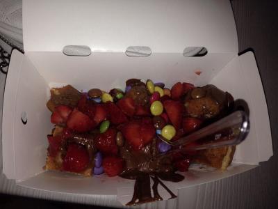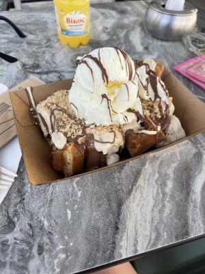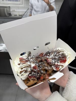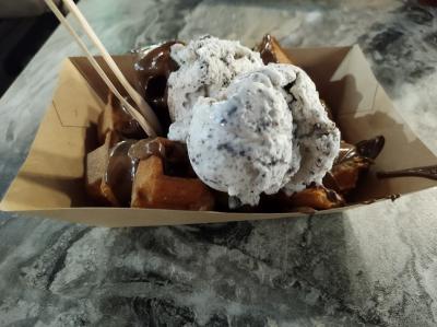 Βάφλες τραγανές, με παγωτό, σοκολατόπιτα, σιρόπι βανίλιας ή καραμέλα βουτύρου.