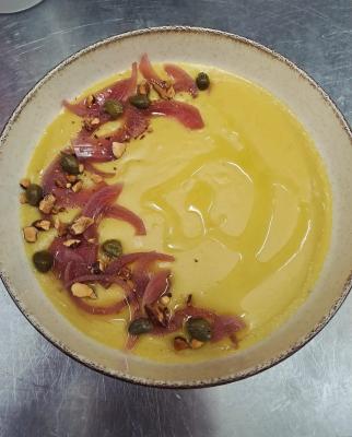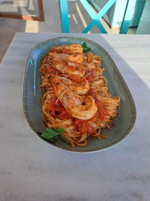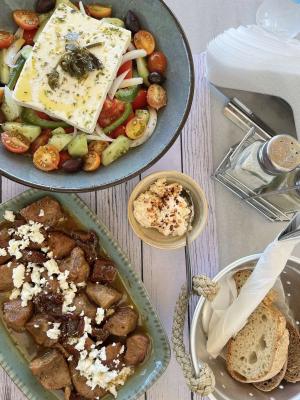 Το μενού περιλαμβάνει χαρακτηριστικά πιάτα όπως το πατατάτο με αρνάκι ή κατσικάκι, φάβα αμοργιανή με κάπαρη και ελαιόλαδο, καθώς και χορτόπιτες με αγριοσέσκουλα, ντοματοκεφτέδες, τηγανητές μελιτζάνες, λαδοτηγανιτά κολοκυθάκια και ψάρια ημέρας. Στα συνοδευτικά ξεχωρίζουν τοπικά τυριά όπως ξινομυζήθρα, γραβιέρα και μελίπαστο, αλλά και θυμάρι, μέλι θυμαρίσιο και λιαστές μένουλες, που δίνουν μοναδική γεύση σε κάθε μπουκιά.